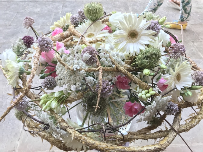 Though we had a slight language barrier Team Italy, Francesco and Antonella tossed me in their car for a chance to forage for some more product which I was very thankful to them for. Francesco helped me find a moderate variety of grasses and vines to enhance the oversize size, depth and texture of the overall design. I learned a valuable lesson in using a purely white and green color harmony as our score took a hit for lack of color and we also lacked on more advanced techniques.